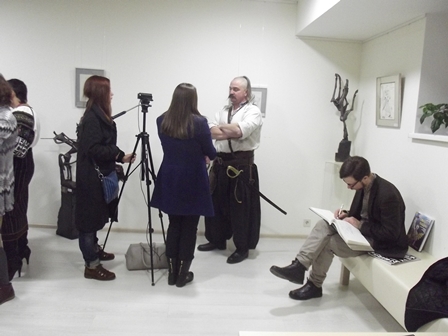 …Найперше дякую пані Аллі, що подзвонила й сказала збирати бебехи та робити виставку. Це моя друга персональна виставка в Києві від 91-го року. Все решта – десь по загряницях. Це, звичайно, не годиться, але дякую, пані Алло, що нагукали. Дякую своїй дружині Лесі, що має дуже вагомі аргументи, які складаються з рогача, макогона й качалки. Вони найбільш доступні до козака. Якби не ці аргументи, мабуть, виставка й не відбулася б. І десь би я проявляв свою актину любов у байраках, на конях, по вепрячих стежках чи співав би з друзями на кручах Трахтемирова.